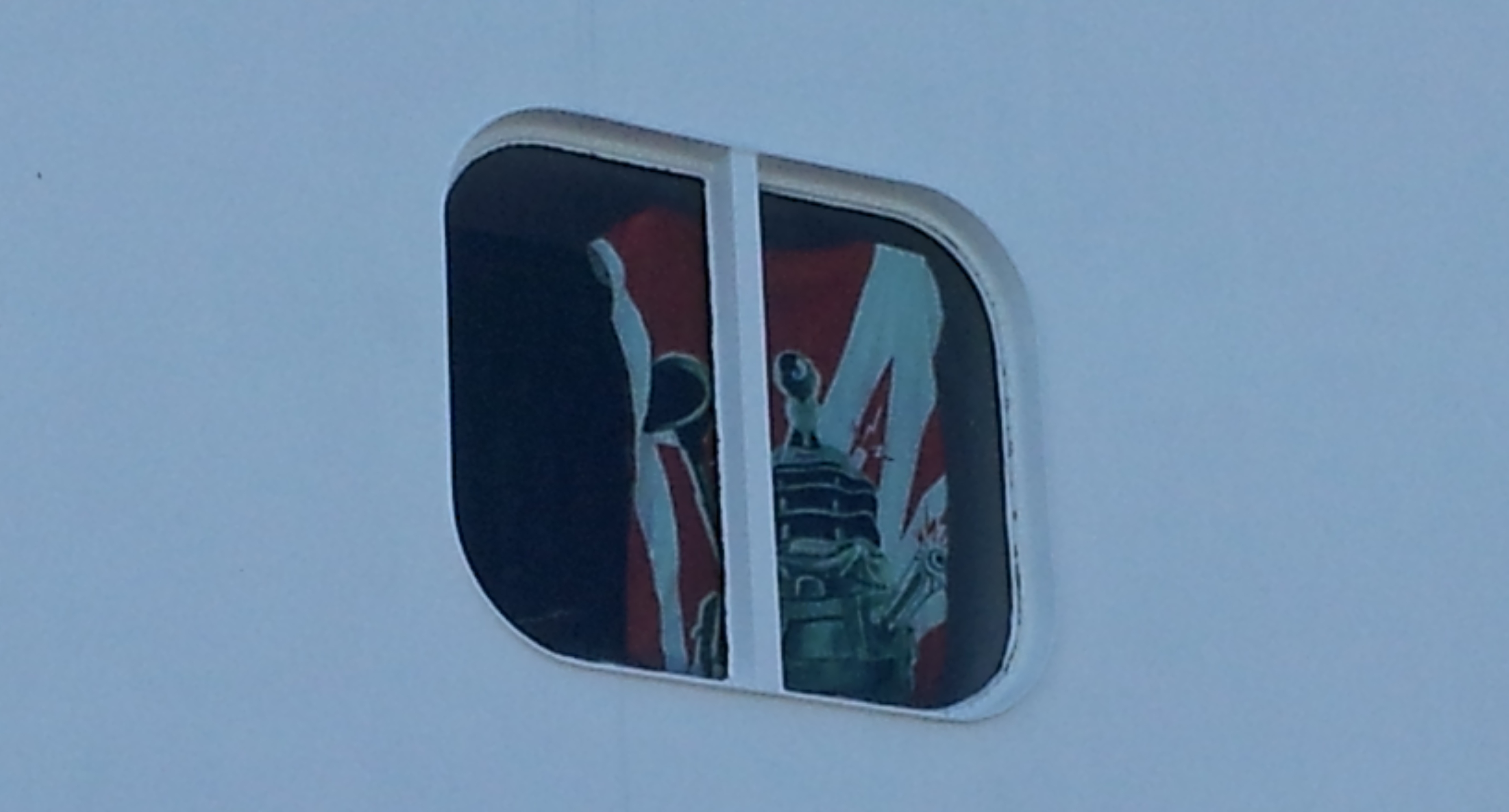 hanging in a cabin window. The towel (seen more closely below) has a Dalek on it.