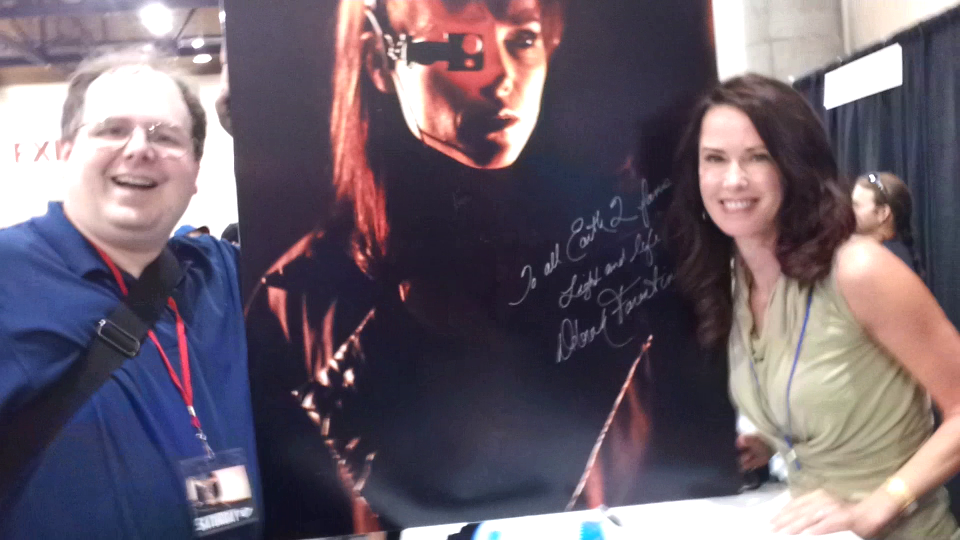 Then I visited Debrah at her autograph table. We spoke for about ten minutes, and I told her how much I adore Earth 2 and how big a fan I am. She signed a number of autographs for me, including my Earth 2 DVD box, but the big one was the wall hanging, which I had lugged from Dallas just for this moment. I had suspected that she might get a little choked up when I told her I had bought it in an auction to benefit Maddie, but I had no idea that I would, too. I thought I was prepared for that, but I was mistaken. I asked Debrah's assistant to film us, and she did. There are two videos because she stopped the camera at one point mistakenly thinking we were finished.