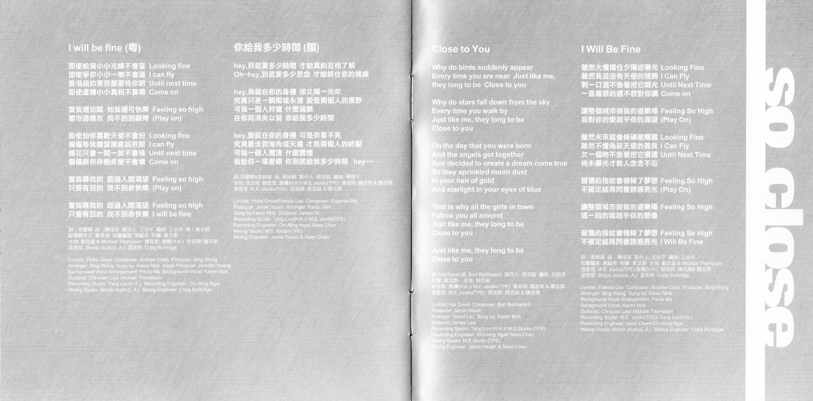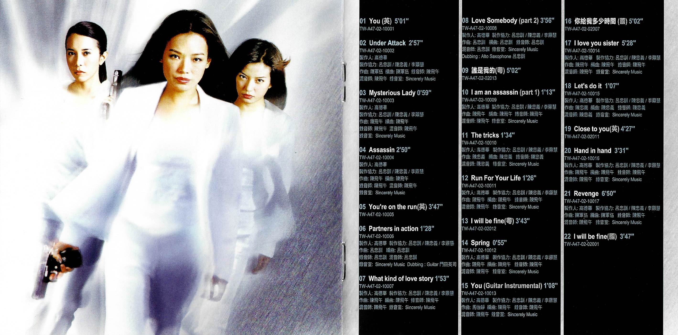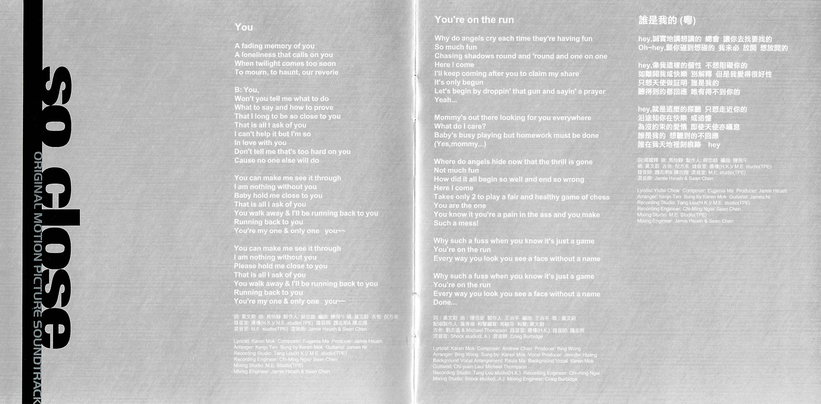 Each photo leads to a larger version. Here is the complete So Close soundtrack. It's so hard to find, and I experienced so much frustration trying to get a copy, that I'm sharing it with everyone. I would never violate copyright of something still in print, but once something is out of print, it's fair game, and this soundtrack has been out of print for many years. I ripped these tracks from the CD. Each file is an MP3. I have not modified them in any way. I have kept the song titles in English as best as I could, even when they don't make sense. Interestingly, one song not on the soundtrack is "(They Long To Be) Close To You" by Corrinne May, used so prominently in the film. (The version on the soundtrack, track 19, is sung by Karen Mok.) This song is available to purchase from Ms. May, but it's not the same recording used in the film (it sounds like it's in a different key). I asked Ms. May about it, and she said she no longer holds the copyright to the exact version used in the film, the studio does. So as far as I can tell, that version is not available for purchase anywhere.